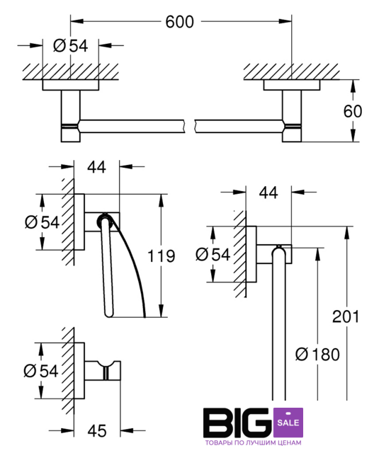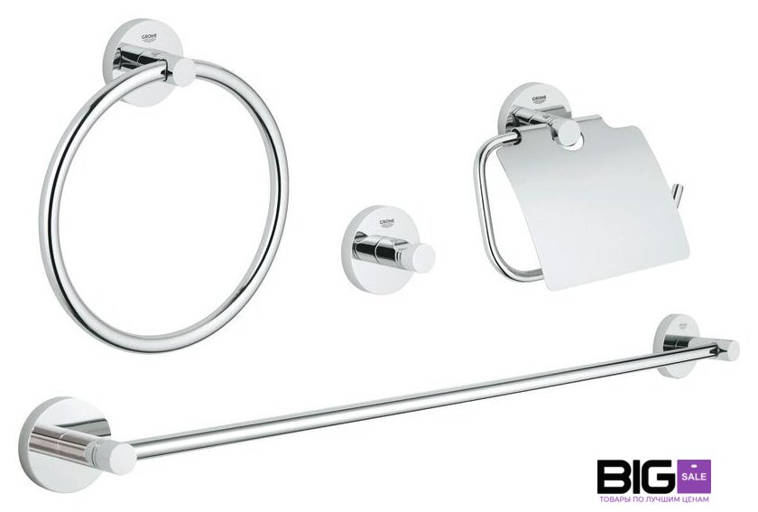 Комплектация | в комплект входят:кольцо для полотенца (40 365 001)крючок для банного халата (40 364 001)держатель бумаги (40 367 001)держатель для банного полотенца, 600 мм (40 366 001)Шурупы и дюбели в комплекте |