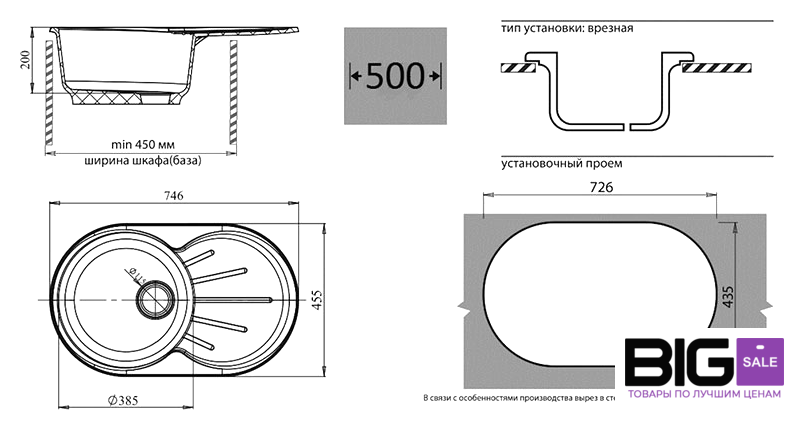 врезная на столешницу, искусственный камень, размеры: 74.6x45.5 см, в шкаф 50 см