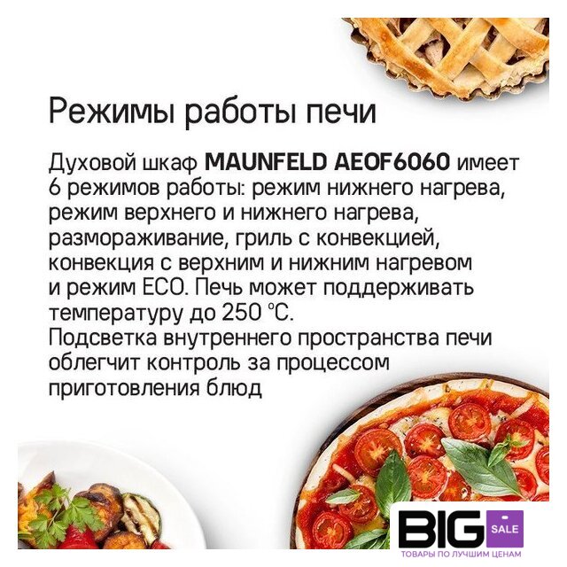 | Режимы работы | нижний нагрев, двухсторонний нагрев, гриль + конвекция, двухсторонний нагрев + конвекция, размораживание |