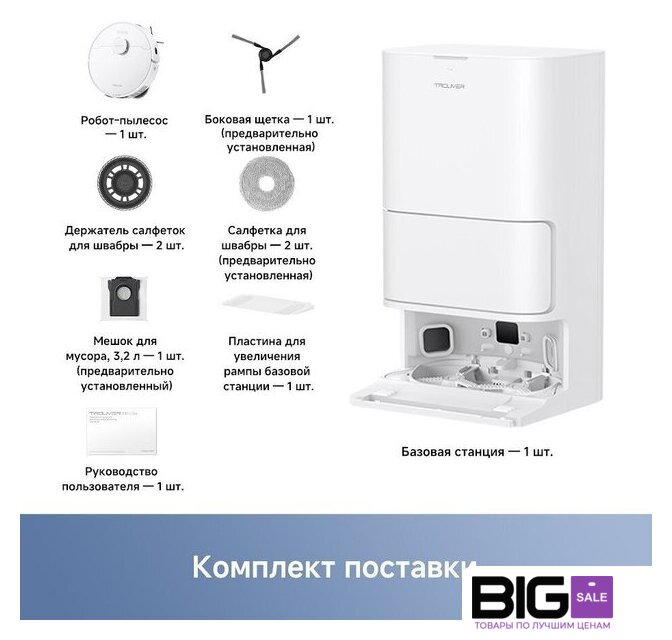 | Комплектация | Робот-пылесос — 1 штБазовая станция — 1 шт Боковая щетка — 1 шт Насадка для швабры — 2 штДержатель насадки для швабры —2 шт (предустановлены)Мешок для мусора — 1 шт(предустановлен)Пластина для увеличения рампыбазовой станции — 1 штРуководствопользователя — 1 шт |