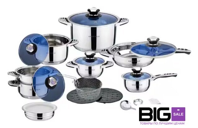 Состав набора | 4 кастрюли с крышкой, 1 кастрюля без крышки, ковш с крышкой, сковорода с крышкой, пароварка с крышкой, набор кухонных аксессуаров из 5 предметов |