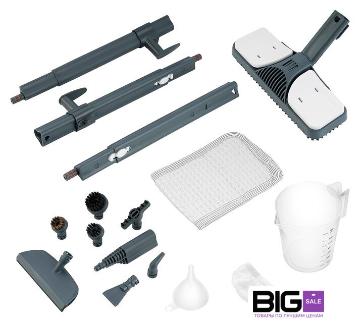 Дополнительные насадки и приспособления | угловая насадка, плоская ворсовая щетка, большая и маленькая нейлоновые щетки, латунная щетка, мерный стакан, воронка, скребок |