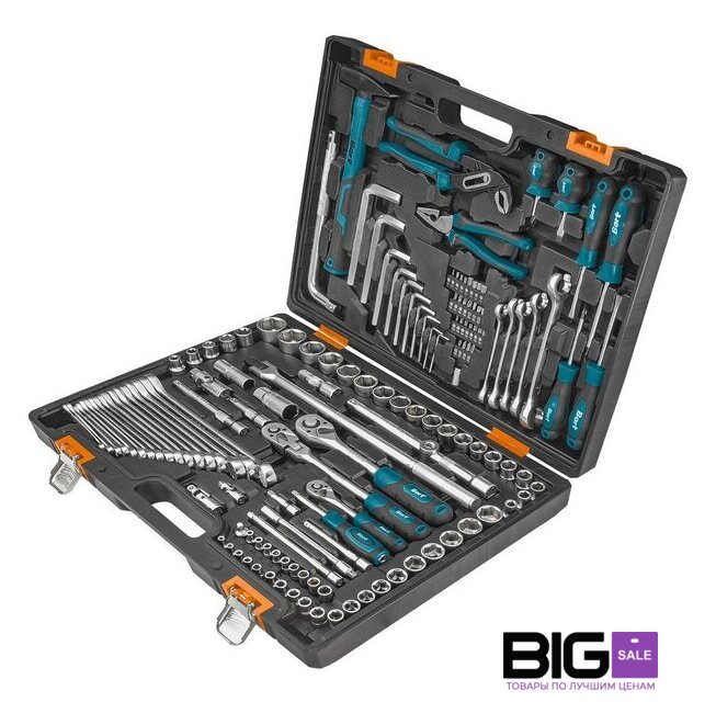 Комплектация | Биты 25 мм (26 шт) Головки 1/4" (9 шт) Головки 1/2" Е-профиль (5 шт) Рукоятка с трещеткой квадрат 1/4 (1 шт) Рукоятка для головок (1 шт) Удлинитель 1/4":50 мм (1 шт) Удлинитель 1/4":100 мм (1 шт) Удлинитель 1/4":150мм (1 шт) Гибкий удлинитель (1 шт) Шарнир карданный 1/4 (1 шт) Головки 3/8" (15 шт) Рукоятка с трещеткой квадрат 3/8 (1 шт) Удлинитель 3/8 75 мм (1 шт) Удлинитель 3/8 250 мм (1 шт) Шарнир карданный 3/8” (1 шт) Головки 1/2" (19 шт) Головки 1/2" Е-профиль (5 шт) Головка торцевая свечная, 1/2" (2 шт) Шарнирный кардан 1/2" (1 шт) Вороток Г-образный 1/2" 250 мм (1 шт) Вороток шарнирный 1/2 430 мм (1 шт) Удлинитель 1/2":75 мм (1 шт) Удлинитель 1/2":150 мм (1 шт) Рукоятка с трещеткой квадрат 1/2 (1 шт) Переходник 3/8"–1/2" (1 шт) Переходник 3/8"–1/4" (1 шт) Держатель для бит (1 шт) Ключ имбусовый (10 шт) Ключ накидной (5 шт) Ключ комбинированный (17 шт) Отвертка (6 шт) Пассатижи (1 шт) Ключ трубный (1 шт) Молоток (1 шт) |