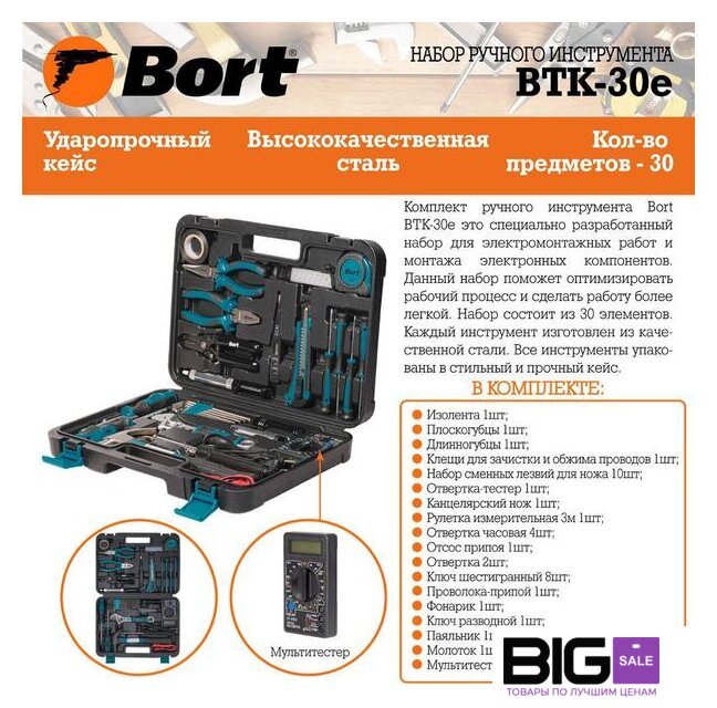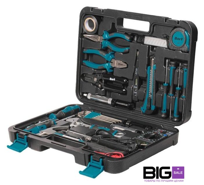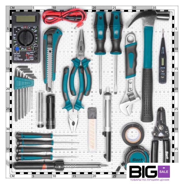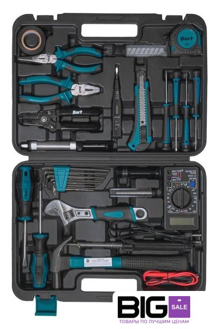 | Комплектация | - Изолента (1 шт)- Плоскогубцы (1 шт)- Длинногубцы 160мм (1 шт)- Приспособление для зачистки проводов (1 шт)- Набор сменных лезвий для ножа (10шт) (1 шт)- Отвертка-тестер (1 шт)- Канцелярский нож (1 шт)- Рулетка измерительная 3м (1 шт)- Отвертка часовая (4 шт)- Отсос припоя (1 шт)- Отвертка (2 шт)- Ключ шестигранный (8 шт)- Проволока-припой (1 шт)- Фонарик (1 шт)- Ключ разводной (1 шт)- Паяльник (1 шт)- Молоток (1 шт)- Мультитестер (1 шт)- Кабель со щупом (2 шт)- Кейс (1 шт) |